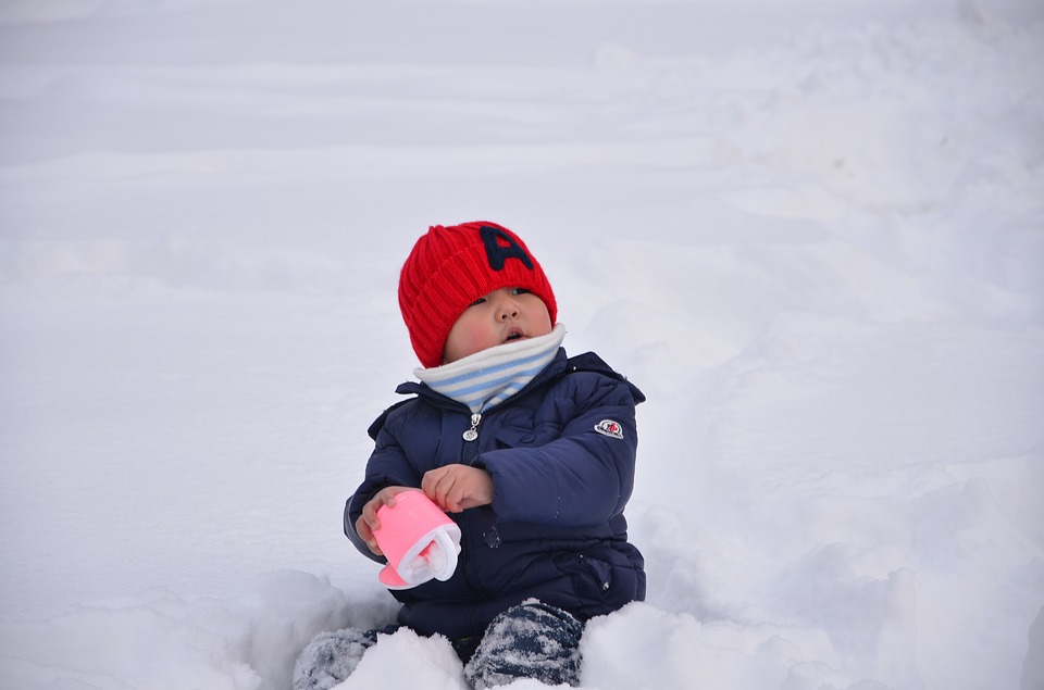 Bei Minusgraden brauchen Babys immer eine gut abschließende Mütze oder Kapuze. Kinder geben nämlich Körperwärme schneller ab als Erwachsene, vor allem über ihren verhältnismäßig großen Kopf. Bei Ausfahrten im Kinderwagen besonders wichtig: Warme Decken allein reichen nicht, auch die Unterlage muss warm genug sein. Ein Fellsack bietet guten Schutz. Ebenfalls gut isoliert eine Campingunterlage mit Aluminiumschicht unter der Matratze. Kinder, die in Tragetüchern oder in Känguruhsäckchen transportiert werden, müssen besonders warm angezogen sein.