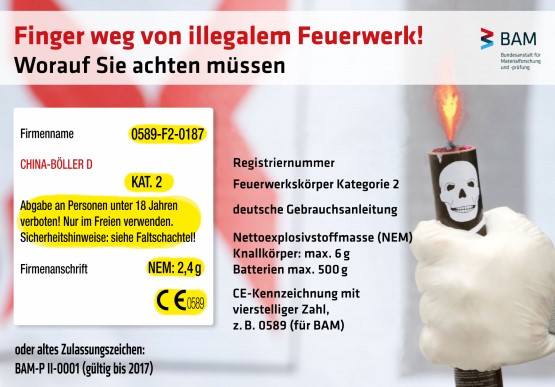 Die BAM rät Verbrauchern beim Kauf von Feuerwerk darauf zu achten, dass die Registriernummer und das CE-Zeichen in Verbindung mit der Kennnummer der Prüfstelle sowie eine deutsche Gebrauchsanleitung vorliegen. Parallel gilt noch für dieses Silvester die alte nationale Zulassungsnummer.