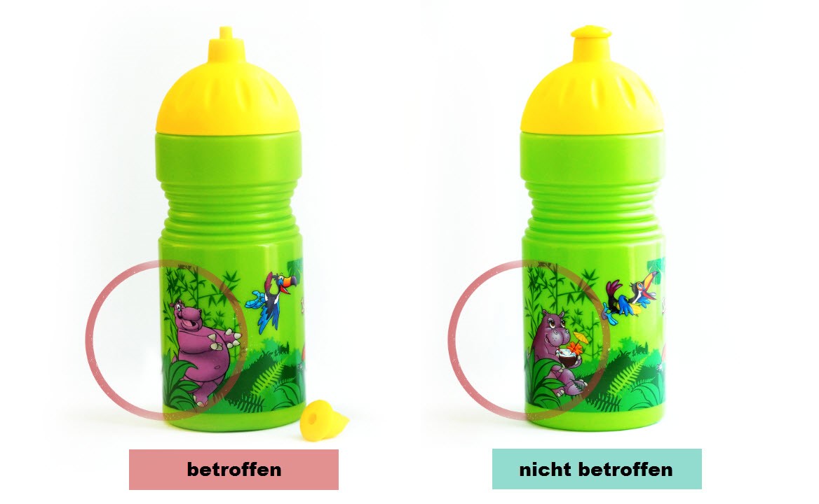 Ob eine Trinkflasche betroffen ist, ist daran erkennbar, dass das lila Nilpferd „Pippa“ auf dem Bild steht (siehe Abbildung oben). Sitzt das Nilpferd, ist die Trinkflasche nicht betroffen.