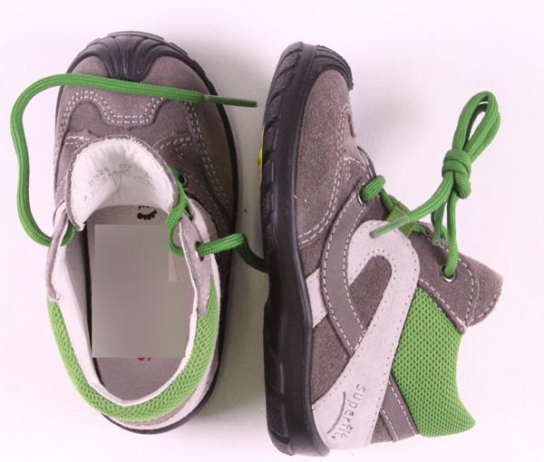 | Beschreibung: | Schuhe für Babys. Das Obermaterial besteht aus dunklem und hellgrauem Leder, mit Applikationen aus grünem Stoff und die Sohle aus dunkelgrauem Kunststoff. Probengröße: 21 |