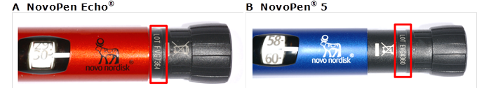 Auf folgender Abbildung ist zu sehen, an welcher Stelle die Chargenbezeichnungen auf dem NovoPen Echo® und NovoPen® 5 zu finden sind. Um diese zu sehen, muss die Dosisvorwahl bei NovoPen Echo® auf 30 Einheiten bzw. bei NovoPen® 5 auf 60 Einheiten eingestellt werden.