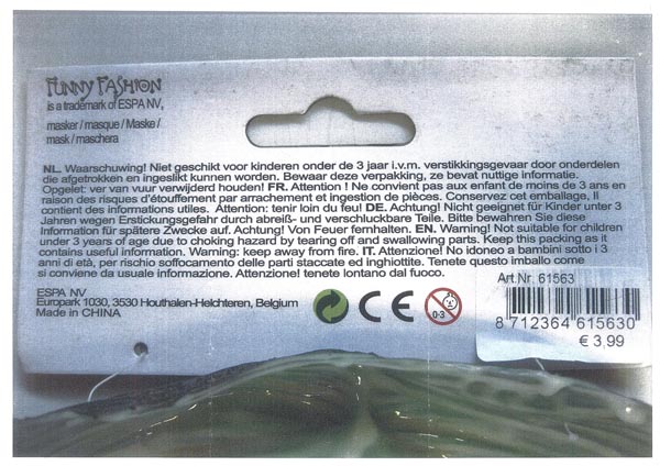 | Produktrisiko: | Das Kunststoffmaterial der Maske enthält Di- (2-ethylhexyl) phthalat (DEHP) (Messwert 45,4 Gew .-%). Dieses Phthalat kann die Gesundheit der Kinder schädigen, was zu einer möglichen Schädigung des Fortpflanzungssystems führt. |