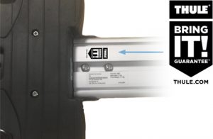 Am neuen und verbesserten Thule Sprint Fahrradträger ist das Thule BringIt! Garantie-Logo an der Unterseite der Schale sichtbar:
