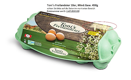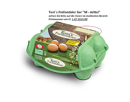 Die Toni’s Handels GmbH ruft Toni’s Freilandeier mit dem Erzeugercode 1-AT-3551199 zurück. Wie das Unternehmen mitteilt, wurde im Zuge der regelmäßigen tierärztlichen Kontrollen der landwirtschaftlichen Betriebe hinsichtlich Salmonellen, bei einem der rund 100 Erzeugerhöfe ein positiver Salmonellenbefund nachgewiesen.
