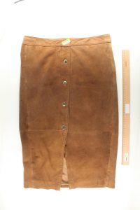 | Beschreibung: | Brauner Rock aus Wildleder mit Knöpfen an der Vorderseite und einem Reißverschluss auf der Rückseite |