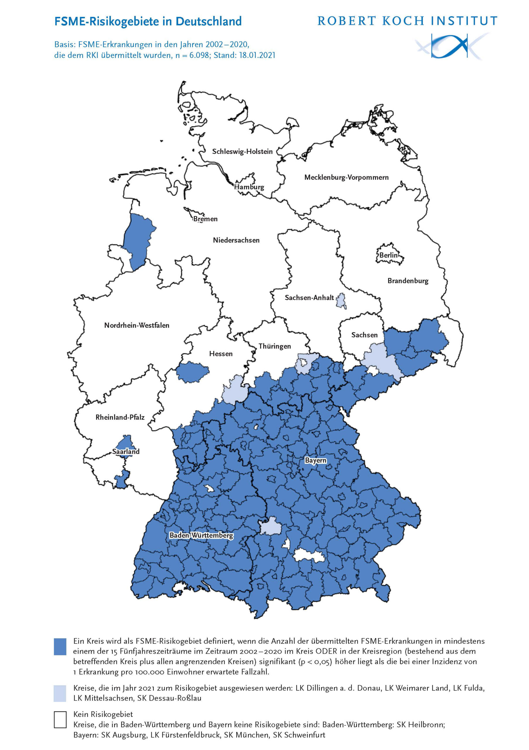 Wie das Epidemiologische Bulletin 9/2021 ausführt, kommen nun 5 neue Risikogebiete hinzu, von denen 4 an bekannte Risikogebiete grenzen: jeweils 1 Kreis in Bayern, Hessen, Sachsen und Thüringen. Als erster Kreis in Sachsen-Anhalt wird der Stadtkreis Dessau-Roßlau Risikogebiet. Dieser Stadtkreis grenzt nicht an bestehende Risikogebiete und ist somit nach dem Landkreis Emsland in Niedersachsen ein weiteres nördlich gelegenes FSME-Risikogebiet. Somit sind aktuell 169 Kreise als FSME-Risikogebiete definiert.