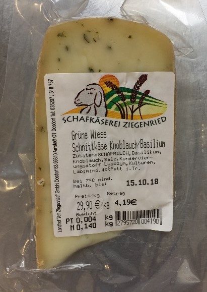 Produkt: Schnittkäse „Grüne Wiese“ (Knoblauch/Basilikum)