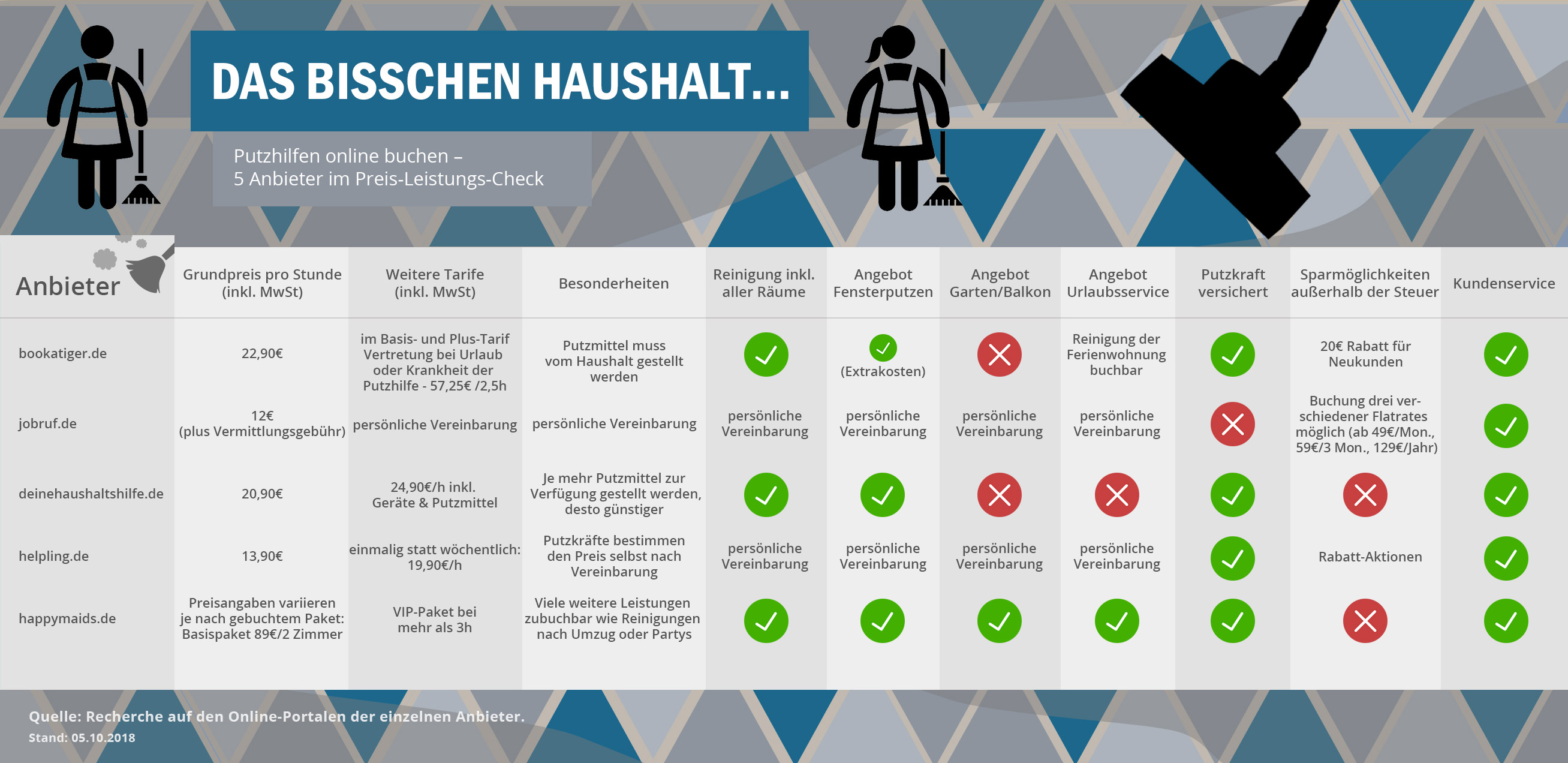 Die Angebote der Online-Anbieter variieren sowohl hinsichtlich der buchbaren Leistungen als auch der Preise und der zu buchenden Zeiträume. Die Basis-Reinigung der Wohnräume bieten allen fünf Anbietern. Je nach Wohnungsgröße, Wohnort, Verschmutzungsgrad und der Bereitstellung von Putzmitteln schwanken die Stundenpreise mitunter stark zwischen 12 und 25 Euro.