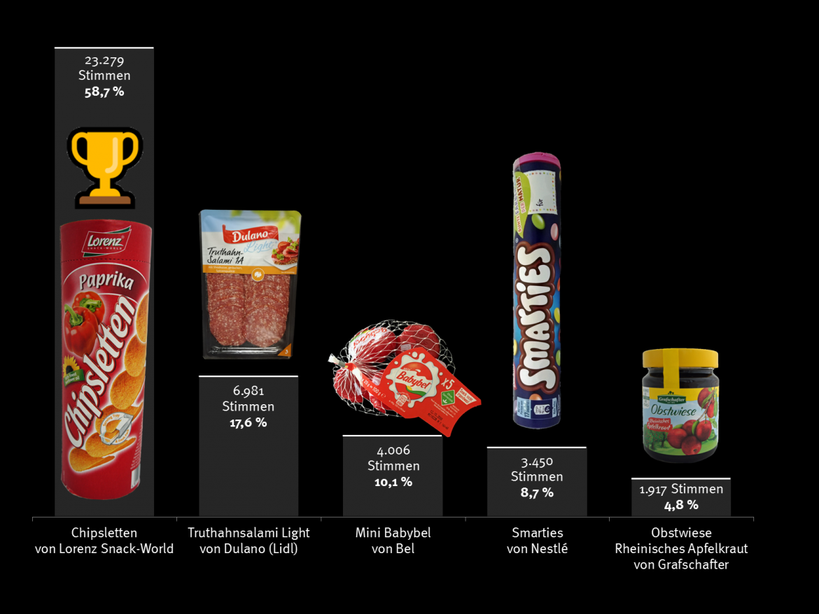 Neben den Chipsletten standen vier weitere Produkte als »Mogelpackung des Jahres 2018« zur Wahl. 39.633 Verbraucher beteiligten sich an der fünften Online-Abstimmung zu Mogelpackungen.