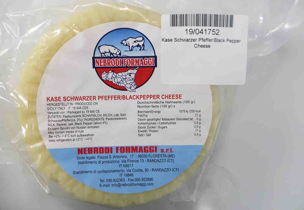Produkt: Schafskäse mit schwarzem Pfeffer – ‚Formaggio primo sale al pepe nero Nebrodi Formaggi s.r.l.‘