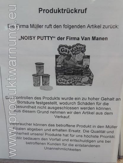 Die Drogeriekette Müller ruft den Artikel „Noisy Putty“ der Firma Van Manen zurück. Wie das Unternehmen mitteilt, wurde bei Kontrollen ein zu hoher Gehalt an Borsäure festgestellt. Eine Gesundheitsgefahr kann nicht ausgeschlossen werden.