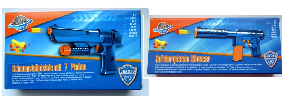 Das TEDi-Qualitätsmanagement informiert über den Rückruf der unten abgebildeten Spielzeugpistolen. Wie das Unternehmen mitteilt, zeigten Produkttests, dass die hohe Schusskraft der Spielzeugpistolen unter Umständen zu Verletzungen führen kann. Deshalb wird von einer weiteren Verwendung der Spielzeugpistolen abgeraten.