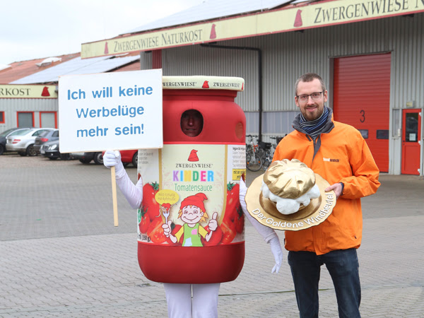 Bei einer Online-Abstimmung der Verbraucherorganisation foodwatch wählte der Großteil der fast 70.000 Teilnehmerinnen und Teilnehmer die „Kinder-Tomatensauce“ des Bio-Herstellers zur dreistesten Werbelüge des Jahres. Die für Kinder beworbene Tomatensauce enthält mehr als doppelt so viel Zucker wie die Erwachsenen-Version – dabei empfiehlt die Weltgesundheitsorganisation (WHO), dass Saucen für Kinder gar keinen zugesetzten Zucker enthalten sollten. foodwatch war am Dienstag vor Ort am Firmensitz von Zwergenwiese in Schleswig-Holstein, um den Negativpreis zu überreichen.