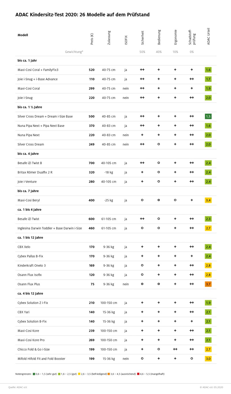 Der Großteil im ADAC Kindesitztest 2020 getesteten Sitze überschreitet die gesetzlichen Anforderungen teils deutlich. Dabei prüfte der ADAC 26 Sitze für alle Altersklassen auf Sicherheit, Handhabung und Schadstoffe. Das Ergebnis: Die Babyschale „Silver Cross Dream + Dream i-Size Base“ erhält als einziger Sitz das ADAC Urteil „sehr gut“, 18 Modelle erreichen „gut“ und sechs weitere ein „befriedigend“. Das Schlusslicht („ausreichend“) bildet der mit 75 Euro billigste Sitz, der „Osann Flux Plus“. Er ist zwar frei von Schadstoffen, zeigt aber Schwächen bei der Bedienung und in der Sicherheit.