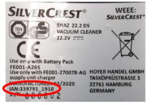 Von dem Warenrückruf ist ausschließlich der Artikel „Handstaubsauger SHAZ 22.2 D5“ der Marke „Silvercrest“ mit der Artikelnummer 339791_1910 (siehe Typenschild) inklusive des dazugehörigen Akkus betroffen. Andere Artikel der Marke „Silvercrest“, insbesondere weitere Produkte der Firma Hoyer Handel GmbH, sind von dem Rückruf nicht betroffen.