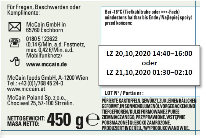 Die McCain GmbH informiert über den Rückruf des Artikels „McCain PomPoms“ in der 450g Packung mit den Produktionsdaten (Lotcode auf Packungsrückseite) LZ 20,10,2020 14:40 – 16:00 & LZ 21,10,2020 01:30 – 02:10. Wie das Unternehmen mitteilt, kann nicht ausgeschlossen werden, dass während des Produktionsprozesses metallische Fremdkörper in das Produkt gelangt sein könnten.