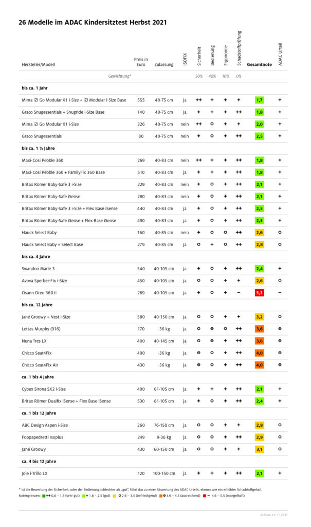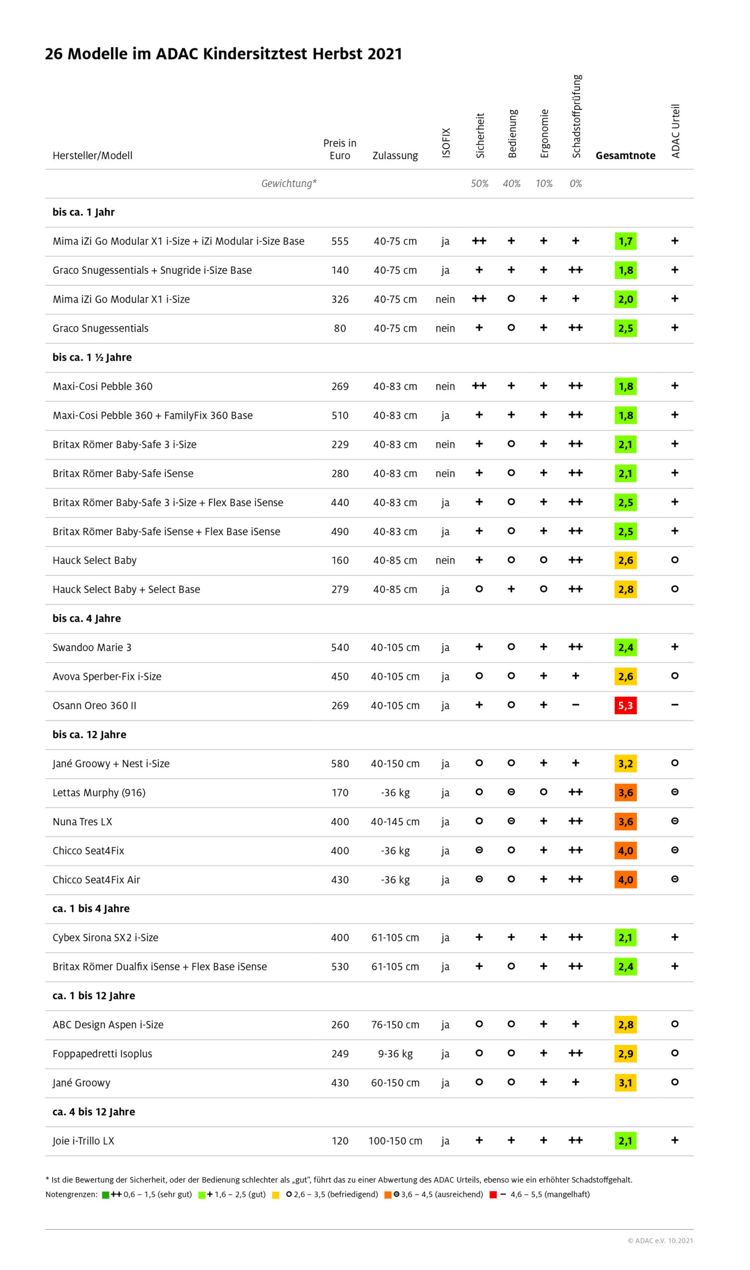 Bereits im Jahr 2017 hat der ADAC erstmals einen mitwachsenden Kindersitz untersucht, der die gesamte Zeit der Kindersitzpflicht abdeckt. Damals wie heute stellen die Produkte aber nur Kompromisslösungen dar, da sie weder auf Größe, Gewicht oder Alter der Kinder spezialisiert sind. Daher überraschte es nicht, dass diese Sitze, meist nur mit „ausreichend“ bewertet werden konnten.