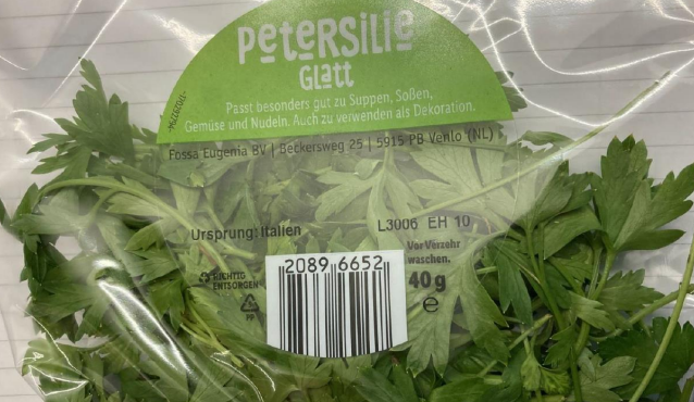 Der niederländische Lieferant Fossa Eugenia BV ruft aktuell das Produkt „Petersilie Glatt, 40g“ mit der Charge L3006 EH 10 und dem Ursprung Italien öffentlich zurück. Das Produkt kann Sellerie enthalten.