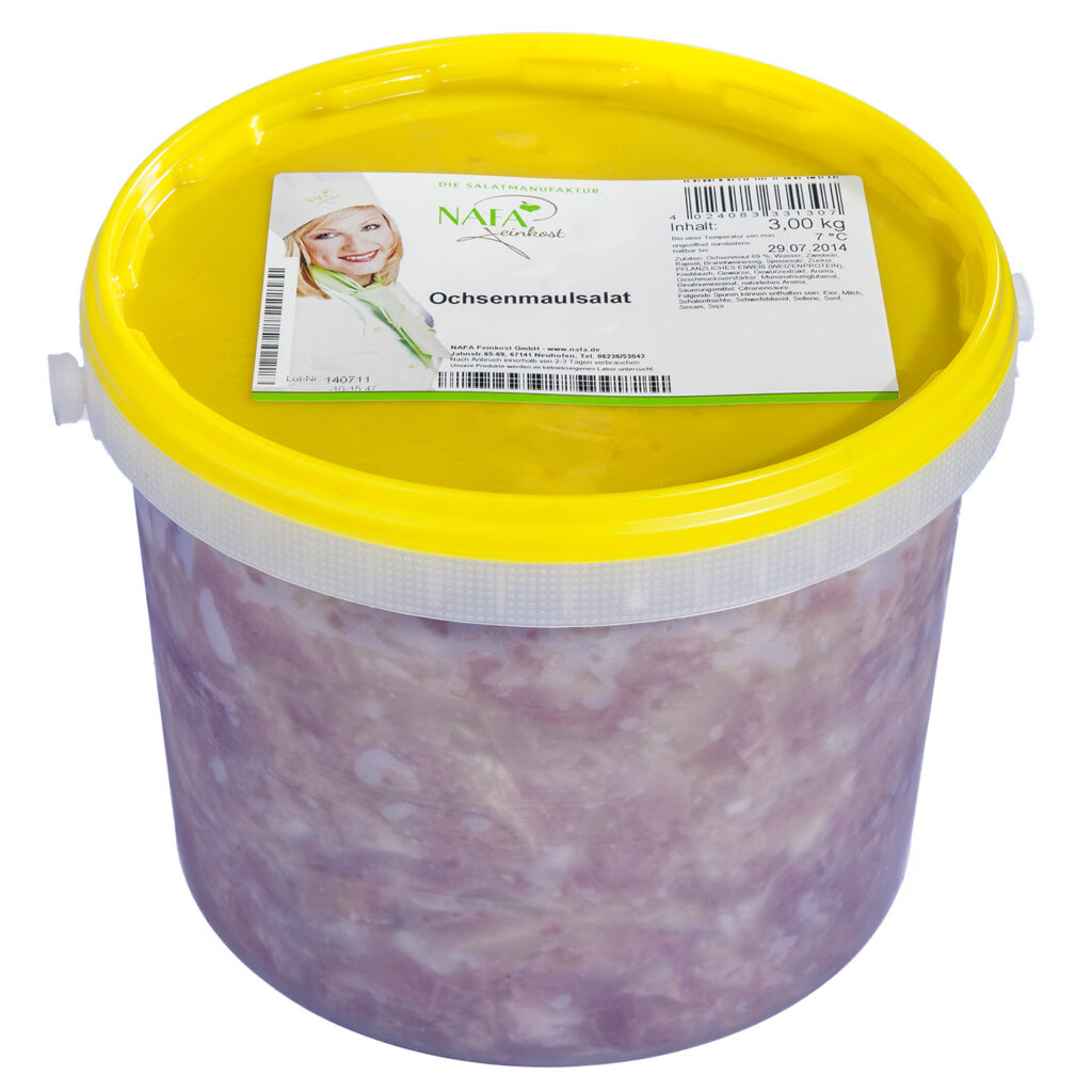 Die NAFA Feinkost GmbH informiert über den Rückruf von Ochsenmaulsalat in drei verschiedenen Gebindegrößen. Grund für den Rückruf der betroffenen Charge ist eine festgestellte Kontamination mit Listerien. Nach Unternehmensangaben sind Rheinland-Pfalz, Baden-Württemberg, Hessen und Frankreich betroffen.