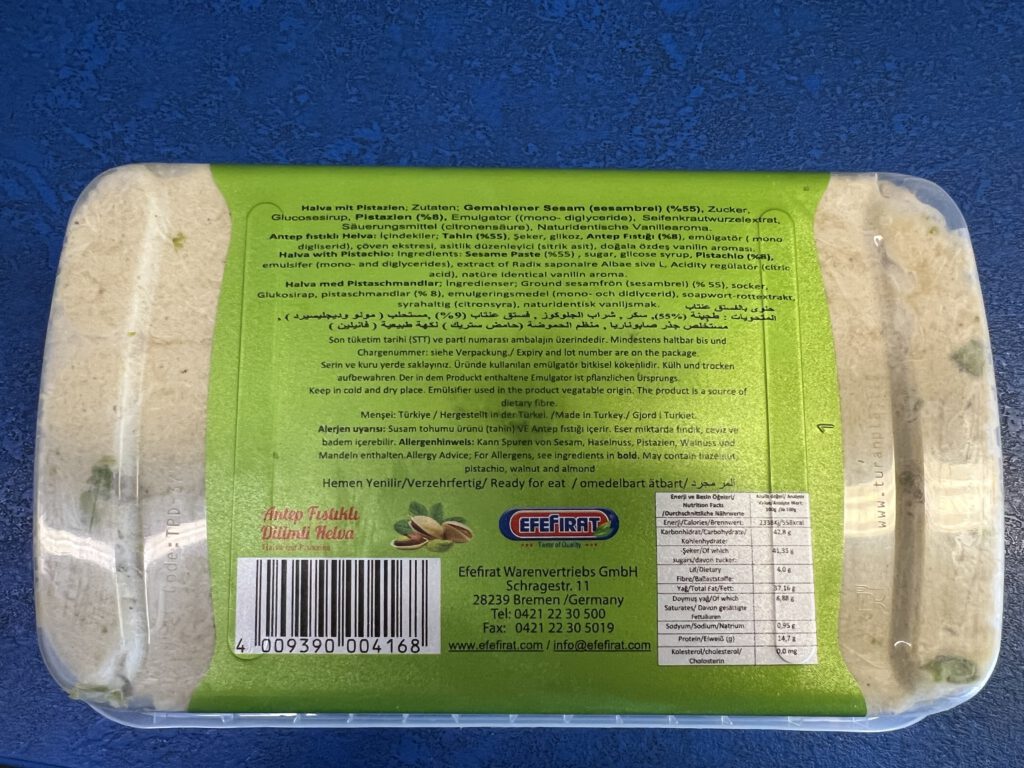 Die Efefirat Warenvertriebs GmbH ruft den Artikel „Halva mit Pistazien“ in der 350g Schale mit dem Haltbarkeitsdatum 22.06.2024 und der Los-Kennzeichnung PND 2206 zurück. Wie das Bundesamt für Verbraucherschutz und Lebensmittelsicherheit (BVL) sparsam mitteilt, wurden Salmonellen in dem Produkt nachgewiesen.
