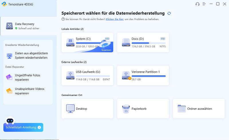 Schließen Sie die Festplatte/SD-Karte/USB-Stick an, auf der die Bilder gespeichert ist. Laden Sie das Tool Tenorshare 4DDiG herunter, starten Sie die Software und wählen Sie einen Ort zum Scannen aus.