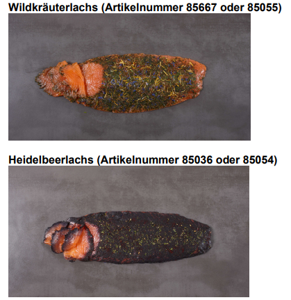 Die Deutsche See GmbH informiert über den Rückruf der Artikel „Heidelbeer- und Wildkräuterlachs“ nachdem bei regelmäßigen Routinekontrollen bei einer Wildkräuter-Blütenmischung, die für zwei gebeizte Lachsartikel als Aufstreu verwendet wird, Salmonellen festgestellt wurden.