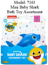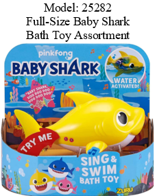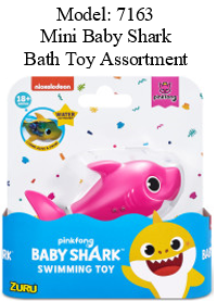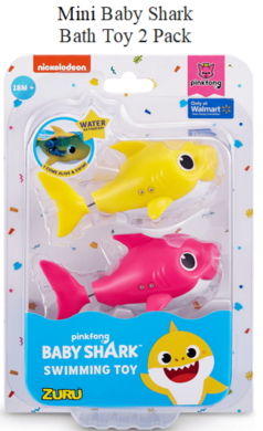 ZURU Toys informiert über den Rückruf von Badespielzeug mit der Verkaufsbezeichnung „Baby Shark” und „Mini Baby Shark”. Die zurückgerufenen „Baby Shark”-Badespielzeuge in der großen Ausführung haben eine Rückenflosse aus Hartplastik mit drei Rillen auf einer Seite der oberen Flosse. Sie messen etwa 7 Zoll (etwa 17,8 cm) von der Nase bis zum Schwanz. Sie wurden in drei Farben verkauft: Gelb, Rosa und Blau. Sie wurden einzeln und in Dreierpacks verkauft.