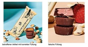 KoRo teilt mit: „Die Produkte sind leicht identifizierbar. Das MHD befindet sich nach folgendem Muster auf der Verpackung “EXP 25.12.2024”. Außerdem sind die falschen Inhalte an der rosafarbenen Füllung zu erkennen“
