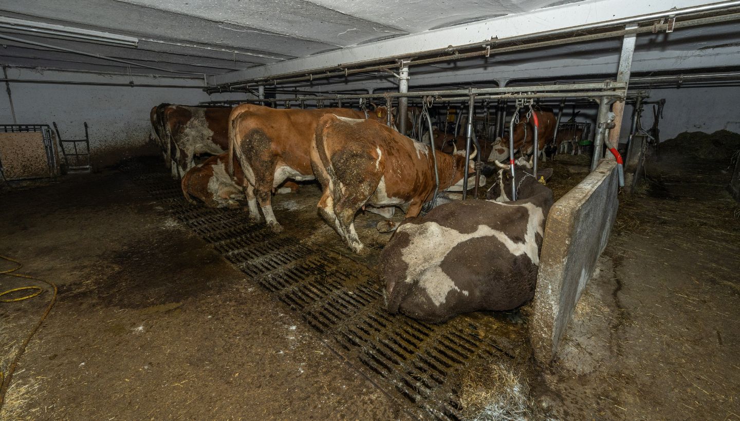 - 5. Dort leben Kühe angebunden auf engstem Raum in einem verschmutzten, mutmaßlich schimmligen Stall.
