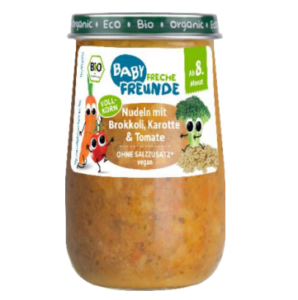 Die erdbär GmbH ruft das Produkt Baby Freche Freunde Beikost Gläschen Nudeln mit Brokkoli, Karotte & Tomate im 190g Gäschen mit dem Mindesthaltbarkeitsdatum (MHD) 28.04.2024