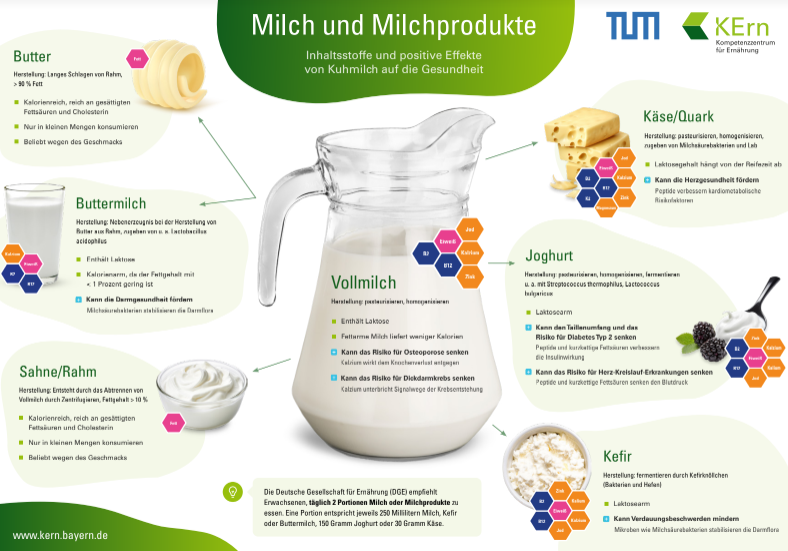 Aber was macht Milch und Milchprodukte so besonders? Welche wertvollen Inhaltsstoffe zeichnen sie aus und wie können wir davon profitieren? Dieser Frage sind Fachexpertinnen und -experten am Kompetenzzentrum für Ernährung (KErn) in Zusammenarbeit mit der Technischen Universität München (TUM) nachgegangen.