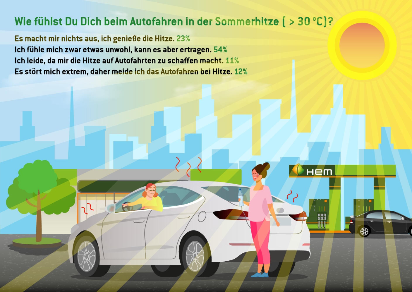 1] Basierend auf einer Marktforschungsumfrage zum Thema „Autofahren bei hohen Temperaturen“, die von der Tankstellenkette HEM im Juli 2024 mit 2.060 Personen über 18 Jahren durchgeführt wurde.