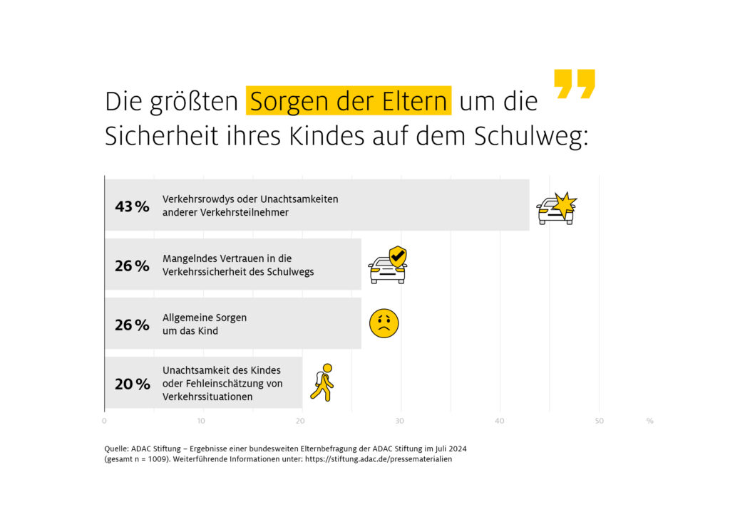 Am meisten Angst um die Sicherheit ihrer Kinder auf dem Schulweg haben Eltern vor Verkehrsrowdys oder wegen möglicher Unachtsamkeiten anderer Verkehrsteilnehmer. 43 Prozent teilen diese Sorge. Es folgen allgemeine Sorgen um das Kind und mangelndes Vertrauen in die Verkehrssicherheit des Schulwegs (jeweils 26 Prozent). 20 Prozent der Eltern befürchten, dass ihr Kind nicht richtig aufpasst oder Verkehrssituationen nicht richtig einschätzt.