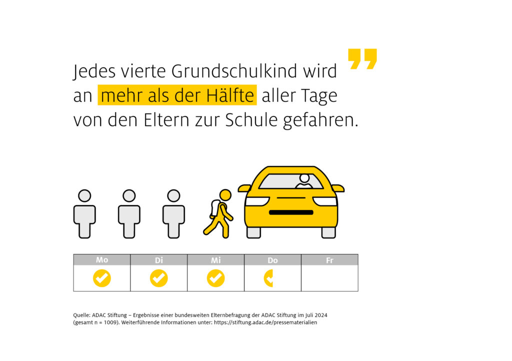 Laut der Umfrage der ADAC Stiftung bringen im Frühjahr und Sommer 23 Prozent der Eltern ihr Kind während der Grundschulzeit mindestens 3- bis 4-Mal pro Woche mit dem Pkw zur Schule. Im Herbst und Winter erhöht sich der Anteil auf 28 Prozent. Über alle Schulformen hinweg beträgt der Anteil der Schüler, die zumeist von den Eltern zur Schule gefahren werden, 17 Prozent in den helleren und 21 Prozent in den dunkleren Jahreszeiten.