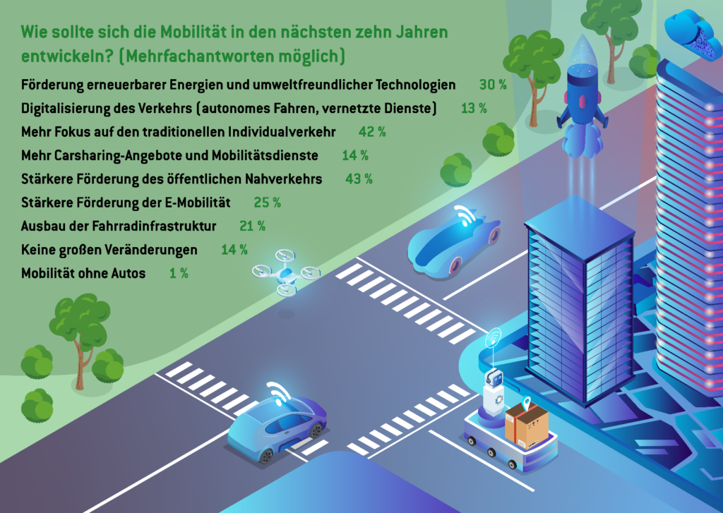 Tradition bleibt im Fokus: 42 Prozent der Befragten wünschen sich für die Zukunft der Mobilität, dass der klassische Individualverkehr weiterhin im Mittelpunkt steht. Fast jeder Zweite (43 Prozent) sieht hingegen die Notwendigkeit, den öffentlichen Nahverkehr stärker auszubauen, um eine nachhaltigere Mobilität zu ermöglichen und überfüllte Straßen zu entlasten. Ein Viertel (25 Prozent) plädiert zudem für mehr E-Ladestationen und eine intensivere Förderung der Elektromobilität. Ob elektrisch oder klassisch – eines steht fest: Autos bleiben ein wichtiger Bestandteil der deutschen Mobilitätsgesellschaft. Nur ein Prozent der Befragten träumt von einer autofreien Zukunft.