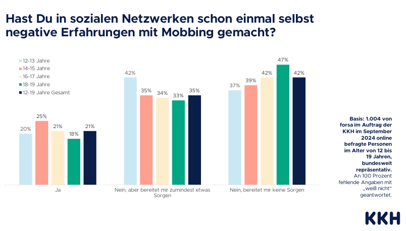 Laut einer forsa-Umfrage im Auftrag der KKH Kaufmännische Krankenkasse hat ein Fünftel der 12- bis 19-Jährigen (21 Prozent) in sozialen Netzwerken schon einmal selbst negative Erfahrungen mit Mobbing gemacht – Mädchen und Jungen nahezu gleichermaßen. Weiteren 35 Prozent der befragten Heranwachsenden bereitet es allerdings zumindest etwas Sorge, dass sie in sozialen Netzwerken beleidigt, bedroht oder belästigt werden könnten.