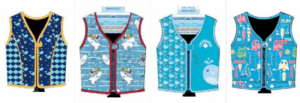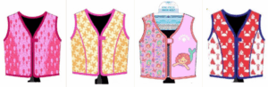 Die Schwimmweste war in folgenden Mustern verfügbar: Wale, Dinosaurier, Haie, Seesterne, Einhörner, Krebse, Fische, bunte Saftbecher oder Seepferdchen. Einige Schwimmesten sind zusätzlich mit einer Sonnenbrille ausgestattet. .