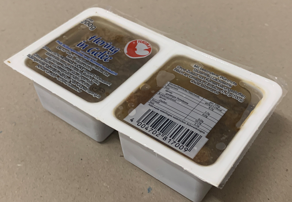 Fekoma Bratheringsfilets in Gelee sind in der Schale – Fekoma Hering in Gelee steht drauf.