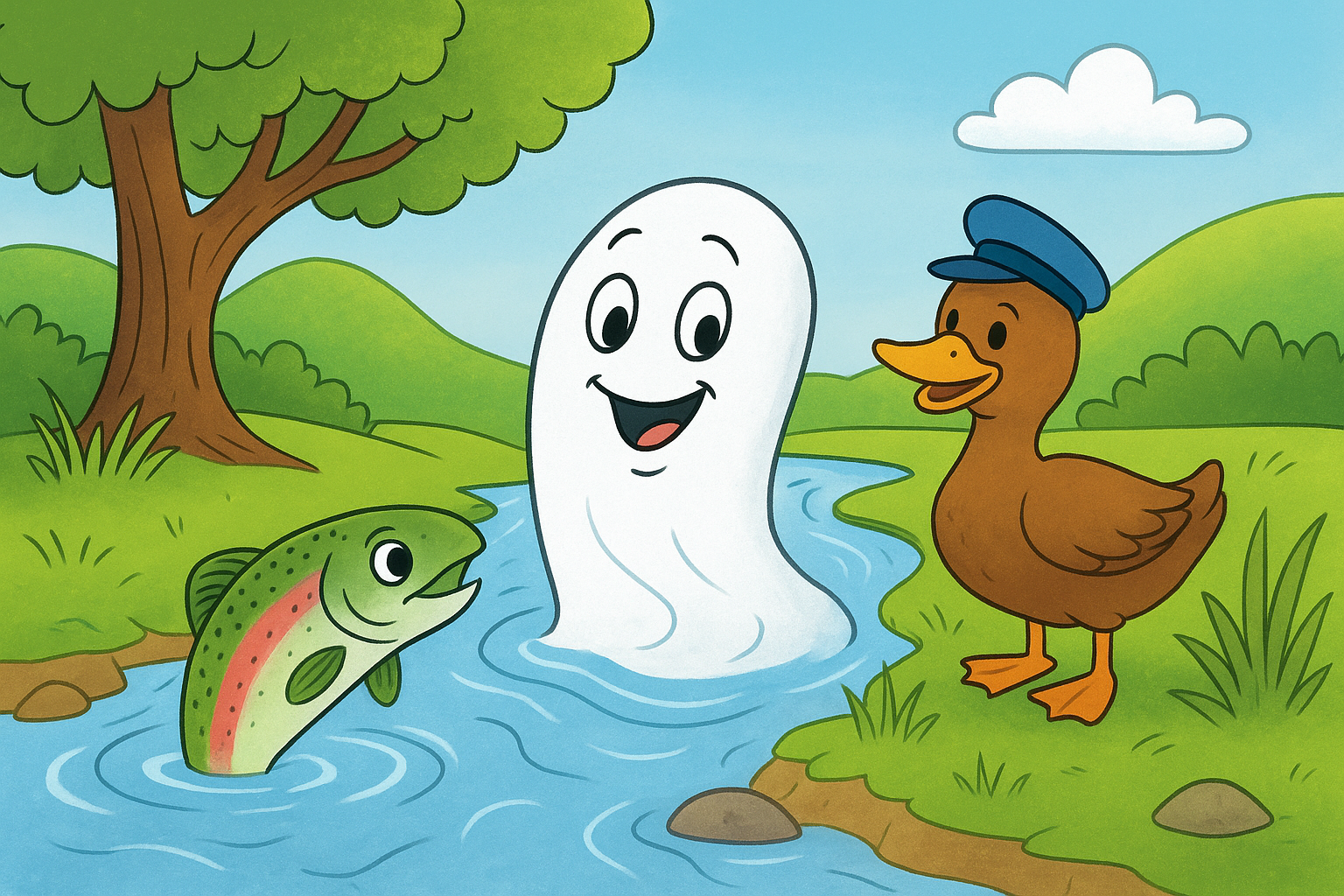 Doch da schwamm schon Finni, der kleine Bachforellenfreund, heran.