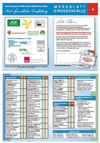 Um die Eltern umfassend über Unfallrisiken aufzuklären, geben die gesetzlichen Krankenkassen, die Kassenärztliche Bundesvereinigung und der Berufsverband der Kinder- und Jugendärzte seit 1999 die „Merkblätter Kinderunfälle“ heraus. Die Merkblätter sollen den Eltern helfen, die Umgebung von Kindern sicherer zu gestalten und Unfälle zu vermeiden. Gemeinsam mit der Bundesarbeitsgemeinschaft „Mehr Sicherheit für Kinder“ und der Bundeszentrale für gesundheitliche Aufklärung wurden die Merkblätter nun umfassend überarbeitet und erweitert.