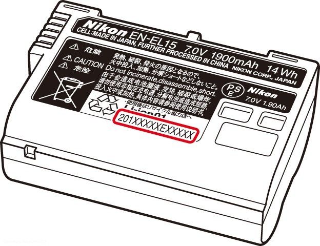 Wenn die 9. Stelle der Chargennummer für den Akku EN-EL15 E oder F lautet, muss der Akku ausgetauscht werden, da er von dem Problem betroffen sein könnte