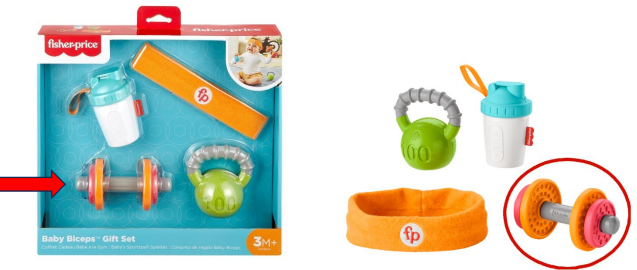 Dieser Rückruf betrifft nur das Kunststoff-Hantelspielzeug, das im Fisher-Price Sportspaß Rassel- und Beißringset verkauft wird. Das Kettlebell-Spielzeug, das Proteinshake-Spielzeug und das Stirnband werden nicht zurückgerufen und können von den Verbrauchern behalten werden.