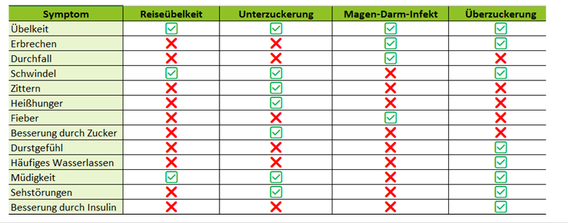 Tabelle mit möglichen Symptomen bei Reisekrankheit, Infekt, Unter- oder Überzuckerung