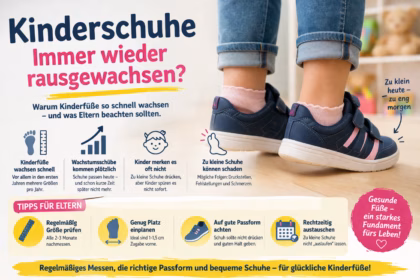 Viele Eltern kennen das Problem: Kaum sind neue Kinderschuhe gekauft, sind sie schon wieder zu klein. Tatsächlich wachsen Kinderfüße besonders schnell – vor allem in den ersten Lebensjahren. Während ein Erwachsener über Jahre hinweg die gleiche Schuhgröße behält, kann sich die Fußgröße bei Kindern ...