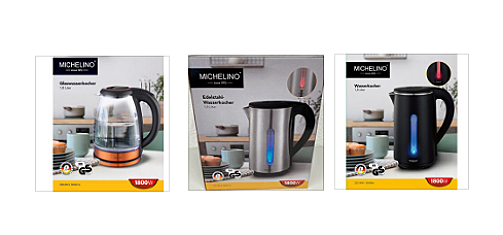 Das EU Schnellwarnsystem Safety Gate (vormals RAPEX) warnt vor Schadstoffen in verschiedenen Wasserkocher der Marke MICHELINO. Betroffen sind Geräte mit einer Leistung von 1800 W und einem Fassungsvermögen von 1,8 Liter in verschiedenen Ausführungen Die betroffenen Produkte weisen eine überhöhte Ko...
